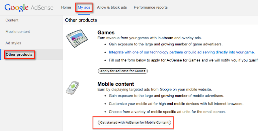 - Click Get started with AdSense for mobile content in the window that appears.